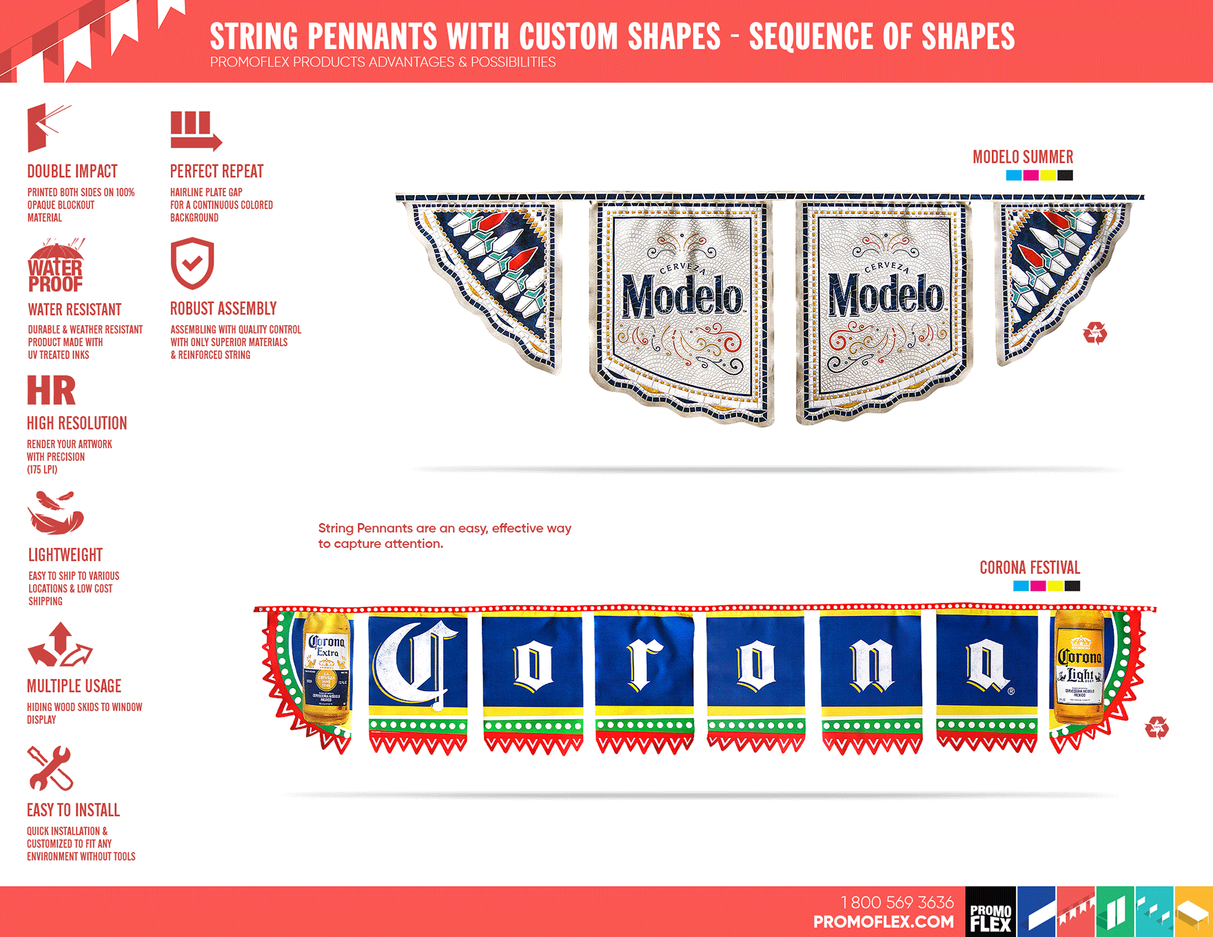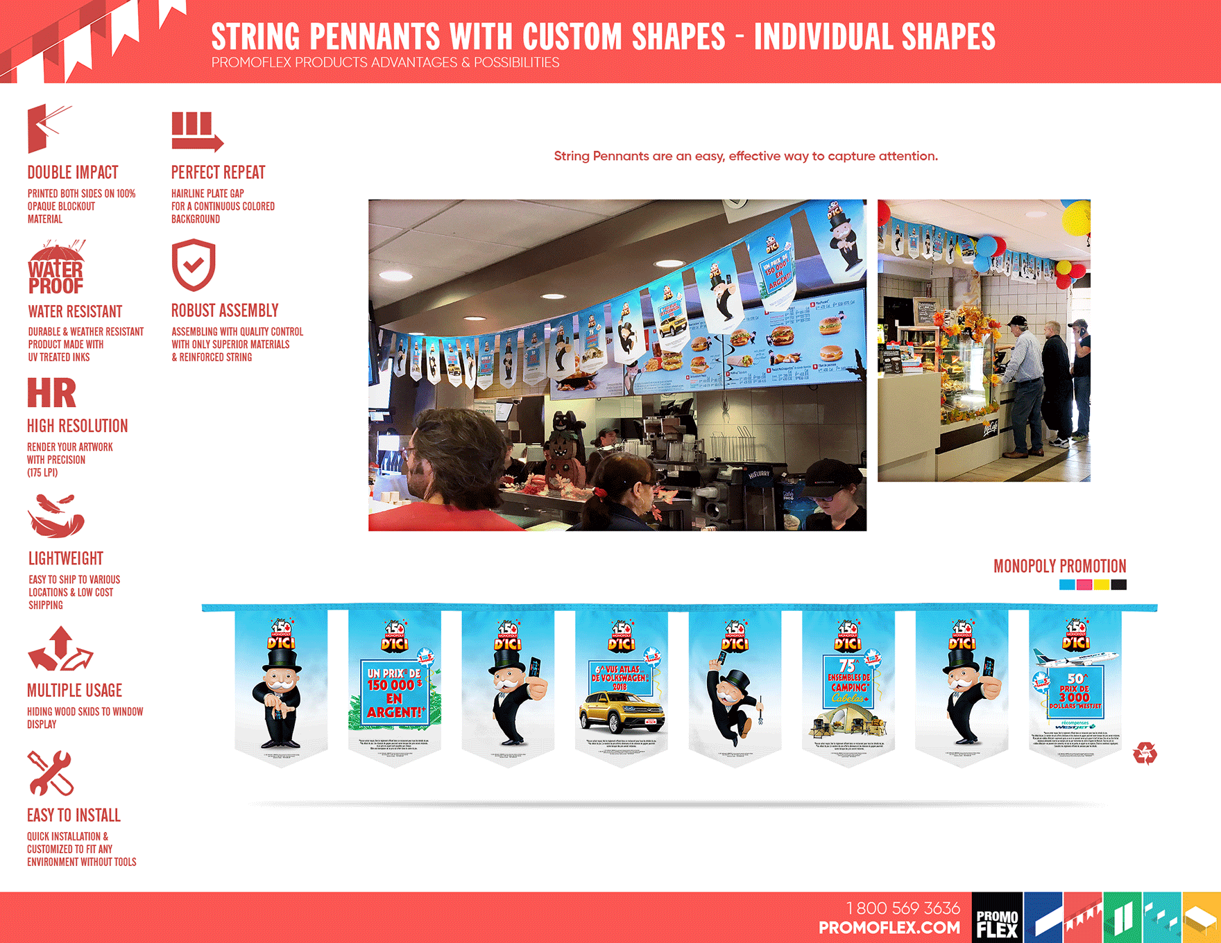 The main industries that use String Pennants are: groceries, convenience stores, supermarkets, breweries, foundations, restaurants, banking institutions, sports teams and racing industries. It’s ideal for one-day promotions or marketing exposition, especially with festivals, sports or racing events. String Pennants are a quick and effective way to capture attention and create a big impact.