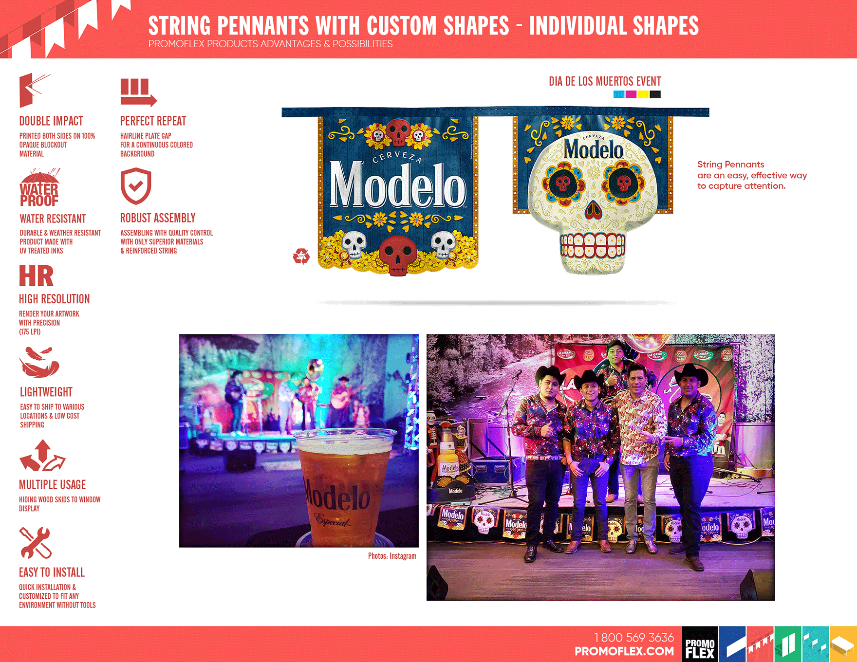The String Pennant offers limitless possibilities. For starters, there are no shape limitations with the String Pennant. For example, a String Pennant can come in individual shapes, a sequence of shapes, a shape of a bottle or even a football helmet.